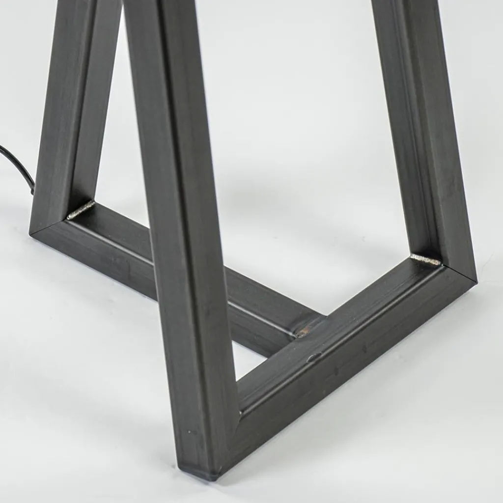 Een stoere robuuste vloerlamp met een hoog design gehalte. Deze vloerlamp is volledig vervaardigd van metaal en door echte ambacht gemaakt op Nederlandse bodem. Het metalen frame heeft een strakke afwerking en is niet voorzien van een finish. Hierdoor is het metaal en alle tekeningen zoals lasnaden goed zichtbaar. Dit maakt de lamp goed geschikt voor een industriële woonstijl. De staande lamp is voorzien van een zwart snoer met een lengte van 180 cm, de dimschakelaar bevindt zich op 45 cm in het snoer. De design lamp wordt geleverd zonder kap, zo kunt u de lamp zelf samenstellen zoals u wenst.