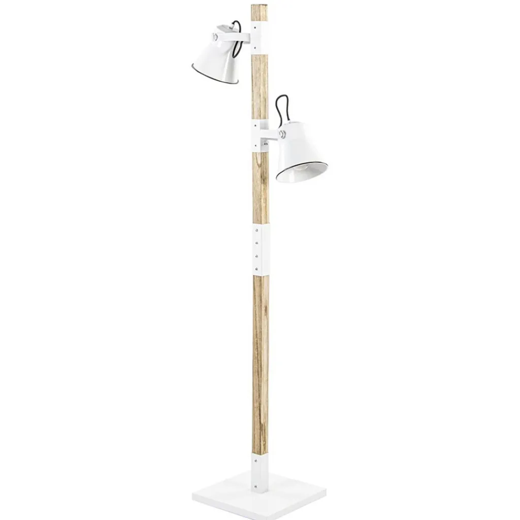 Deze houten vloerlamp met witte elementen past mooi binnen de landelijke trend. Het lichte hout en het witte metaal geven een frisse look die goed past bij een licht interieur. Het armatuur is gemaakt van hout waar op twee plekken een verstelbare wit metalen kap is bevestigd. De twee kapjes zijn los van elkaar te stellen zodat u altijd de gewenste lichtverspreiding kunt creëeren. De landelijke vloerlamp is voorzien van een vierkante wit metalen voet en een zwart snoer van 205 cm, waarbij de schakelaar zich op 85 cm van de lamp bevindt. De houten vloerlamp wordt geleverd exclusief lichtbron (2x E27).