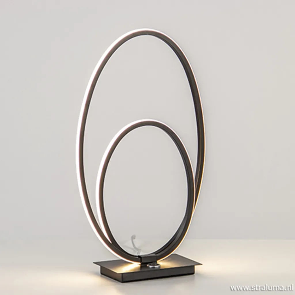 Een moderne LED tafellamp met touchdimmer. De mat zwarte tafellamp is op de voet voorzien van een touchknop die drie dimstanden kent. De bogen van de lamp zijn volledig voorzien van LED strips wat een mooie sfeervolle verlichting geeft en ook nog eens energiezuinig is. Een ideale sfeermaker met modern design!