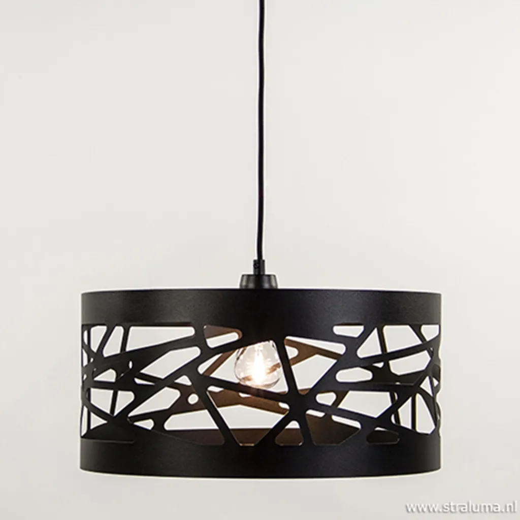 Een moderne hanglamp met opengewerkt metaal. De grote ronde metalen kap is op speelse wijze opengewerkt waardoor de kap veel licht door laat. Dit zorgt ervoor dat de lichtbron van belang is om de juiste sfeer te creëren. Het metalen frame is in een mooie mat zwarte kleur gespoten wat de ronde hanglamp prima geschikt maakt voor een modern, industrieel of Scandinavisch interieur. De grote kap hangt aan een zwart stofomwonden snoer en wordt aan het plafond bevestigd met een zwarte ronde bevestiging. Een stoere en speelse design hanglamp die perfect past boven een eettafel, salontafel, keuken of slaapkamer.