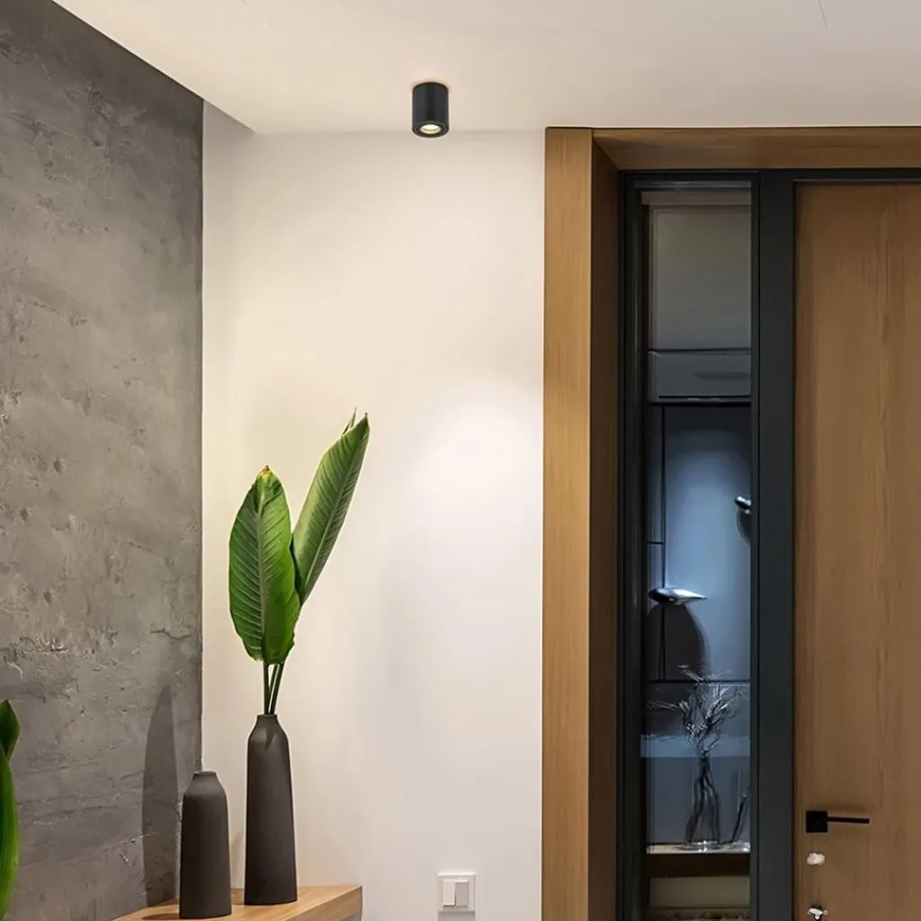 Deze kleine opbouwspot zorgt voor een hoop extra sfeer in de ruimte. De cilindervormige spot is voorzien van een GU10 fitting en is 45° te kantelen naar de gewenste richting. De plafondspot is volledig van metaal en uitgevoerd in het mat zwart. Door het kleine formaat is de plafondlamp overal toe te passen. De cilinder wordt gemonteerd door deze op de bevestiging te draaien.