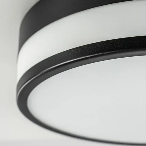 Een moderne plafonnière met een ideale functie. De ronde plafondlamp bestaat uit opaal glas met zwart metaal en is voorzien van geïntegreerd LED. Voordeel van dit LED, is dat deze in 3 standen is te dimmen. Dit werkt gemakkelijk via de wandschakelaar. U hoeft dus geen externe dimmer te kopen. Met een druk op de knop gaat de lamp in de sterkste stand aan, zet u de lamp direct weer uit en aan, dan dimt de lamp een stap verder, doet u dat nogmaals dan is de lamp in zijn laagste stand. Creëer dus gemakkelijk en snel de juiste sfeer met deze moderne plafondlamp. De zwarte plafonnière is IP44 goedgekeurd zodat deze in de badkamer kan worden toegepast, maar kan ook prima dienen in een ruimte als de hal of keuken. Met 3000 Kelvin zorgt de lamp voor een sfeervolle warm witte verlichting en de 2500 lumen zorgt voor een goede lichtintensiteit, genoeg om een hele ruimte te verlichten.