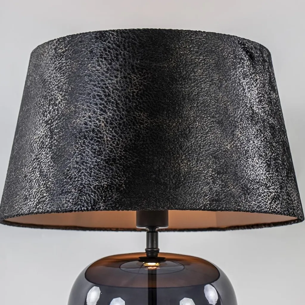 Deze prachtige lamp heeft een chique en luxe uitstraling door de combinatie van de materialen en kleuren. Zo heeft de tafellamp een glazen voet die is uitgevoerd in het zwart. Dit is gecombineerd met een stoffen kap in het zwart/taupe met een glinstering erin. De combinatie maakt de tafellamp perfect geschikt voor een hotel chic, strak klassiek of luxury interieur. De kap wordt ondersteund door een kogelgewricht zodat u de kap goed recht kunt zetten. De glazen tafellamp met kap heeft een zwart snoer met een lengte van 180 cm en een knipschakelaar op 30 cm. De chique tafellamp wordt geleverd zonder lichtbron.