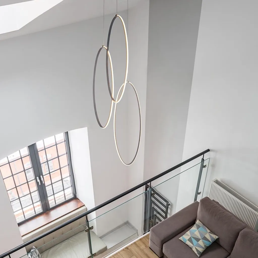 Een moderne luxe hanglamp die perfect geschikt is voor een vide. De moderne hanglamp heeft een maximale hoogte van 350 cm en is naar wens te verstellen. De lamp bestaat uit drie zwarte ovale ringen welke aan de buitenzijde zijn voorzien van een LED strip. Het LED geeft met 2700 Kelvin een sfeervolle warm witte verlichting en zorgt met 8640 lumen voor een goede lichtopbrengst. De drie ovale LED ringen zijn los van elkaar in hoogte te verstellen zodat u deze zo kunt hangen dat ze het beste in uw vide uitkomen. De zwarte hanglamp wordt met een ronde bevestiging aan het plafond opgehangen.