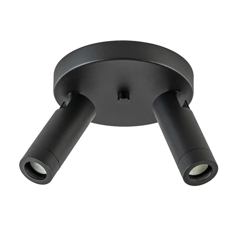 Een moderne ronde 2-lichts plafondspot met strakke vormgeving. Deze 2-lichts plafondspot is gemaakt van mat zwart metaal. De spotjes zijn los van elkaar verstelbaar. Ideaal om meerdere aspecten van een ruimte tegelijk uit te lichten. De lamp past goed in een hal of de slaapkamer. Het leuke aan deze spot is dat hij wordt geleverd met zowel een mat zwarte als een goudkleurige fitting ring. U kunt er zelfs voor kiezen de fitting ring weg te laten en de 2-lichts spot af te maken met grotere lichtbronnen. Zo kiest u zelf welke look u wilt.