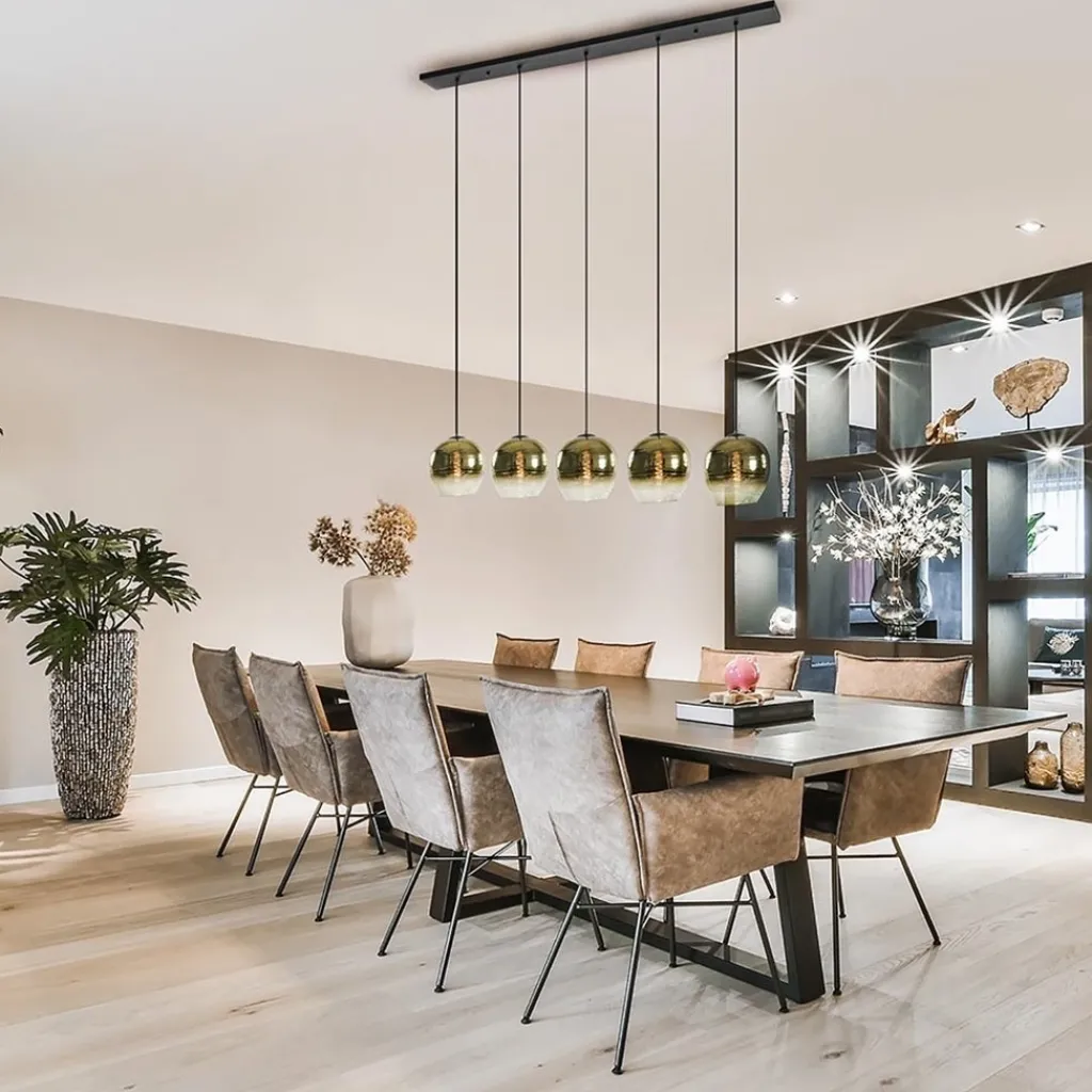 Deze 5-lichts hanglamp geeft een trendy chique touch aan het interieur. De eettafelhanglamp heeft een lange plafondbalk van 130 cm waar de 5 snoeren over zijn verdeeld. Ieder snoer is voorzien van een glazen kap die is afgewerkt met een golden gradient. De kap begint aan de bovenzijde met een gouden titanium kleur en verloopt naar onder steeds meer naar helder glas. Dit verloop geeft het glas een unieke look en geeft tegelijk een luxe uitstraling. De kappen zijn strak op één lijn te hangen maar kunnen ook speels op diverse hoogtes worden gehangen. De luxe eetkamerhanglamp wordt geleverd zonder lichtbron en is dimbaar middels een externe dimmer (exclusief).