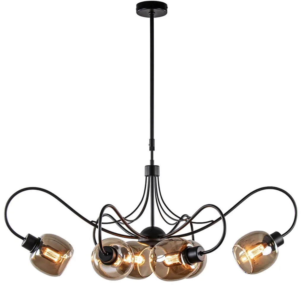 Een stijlvolle hanglamp met een sierlijk design. De hanglamp heeft een metalen armatuur dat is uitgevoerd in het mat zwart. De sierlijke armen geven de lamp een klassieke uitstraling. Het zwarte armatuur is mooi gecombineerd met smoke glas wat de lamp weer een trendy en chique look geeft. De hanglamp is in hoogte te verstellen met een minimale hoogte van 90 cm en een maximale hoogte van 125 cm. Ideaal voor boven een eettafel. De 6-lichts hanglamp met smoke glas wordt geleverd exclusief lichtbronnen en is dimbaar middels een externe dimmer (exclusief).