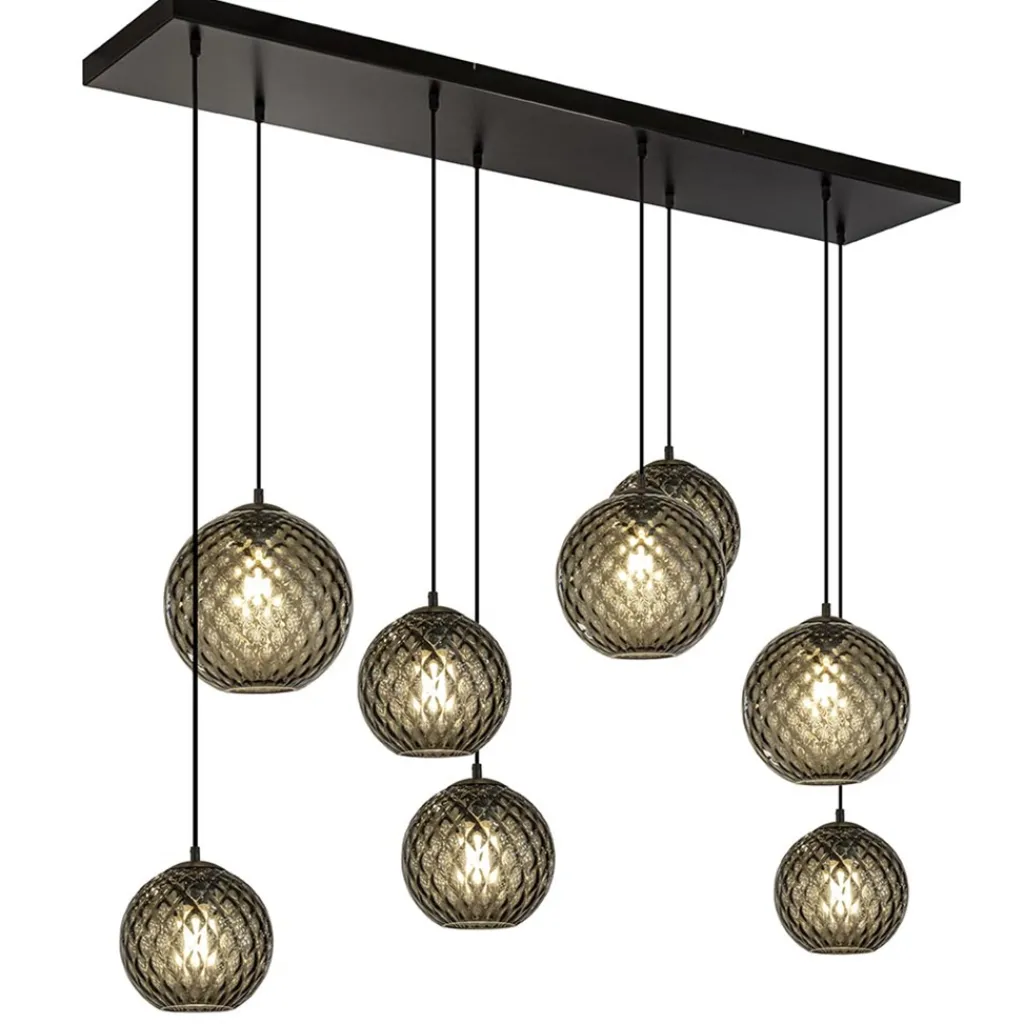 Straluma 8-Lichts eettafelhanglamp zwart met smoke glazen kappen reliëf> Eettafellampen|Pendel Lampen