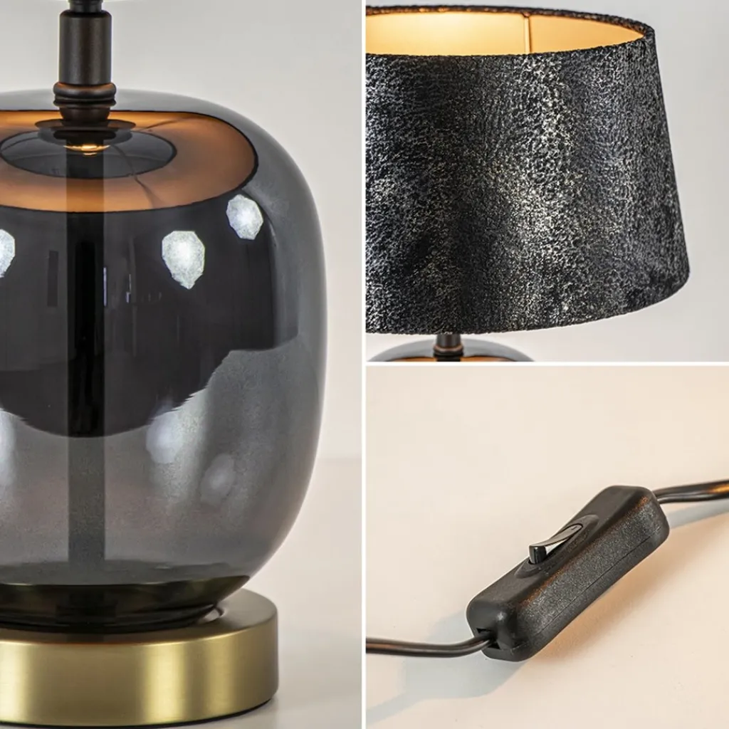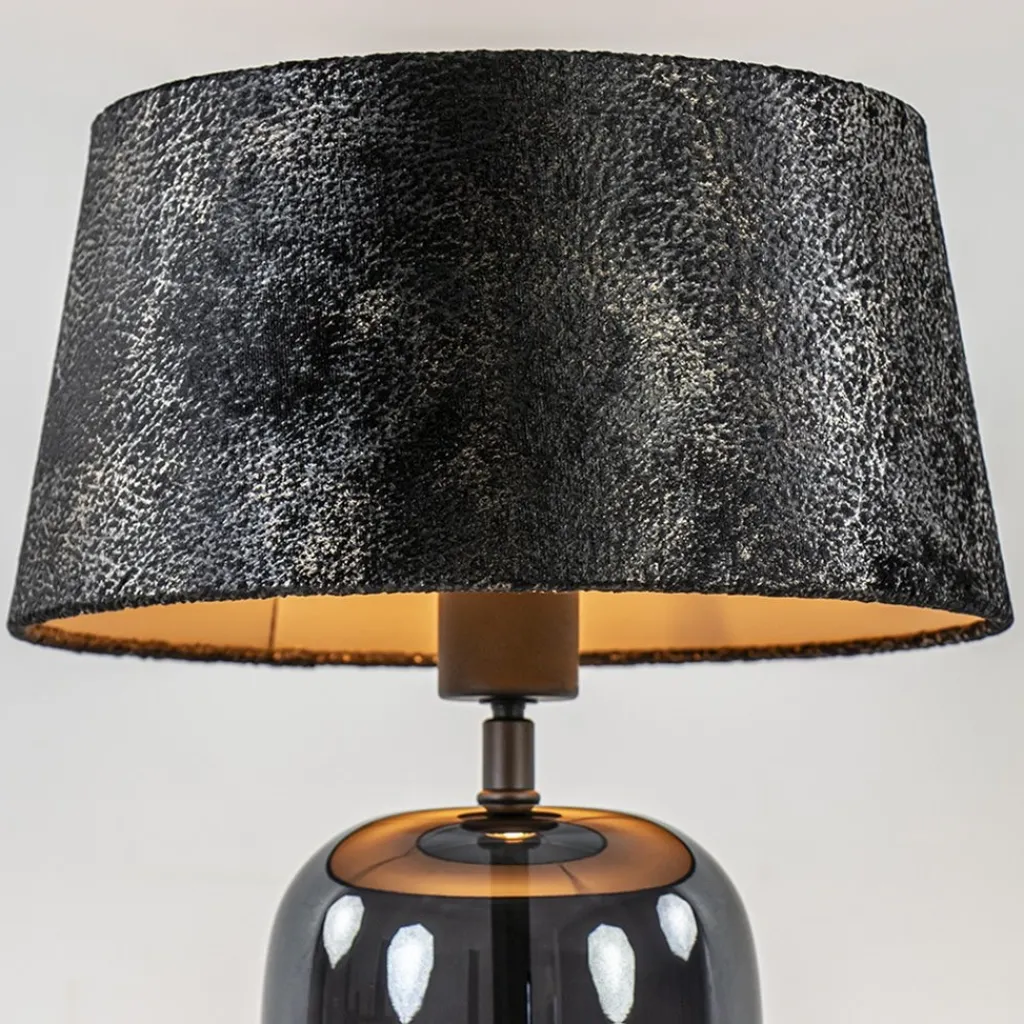 Deze kleine maar prachtige lamp heeft een chique en luxe uitstraling door de combinatie van de materialen en kleuren. Zo heeft de tafellamp een glazen voet die is uitgevoerd in het zwart. Dit is gecombineerd met een stoffen kap in het zwart/taupe met een glinstering erin. De combinatie maakt de tafellamp perfect geschikt voor een hotel chic, strak klassiek of luxury interieur. De kap wordt ondersteund door een kogelgewricht zodat u de kap goed recht kunt zetten. De glazen tafellamp met kap heeft een zwart snoer met een lengte van 170 cm en een knipschakelaar op 30 cm. De chique tafellamp wordt geleverd zonder lichtbron.