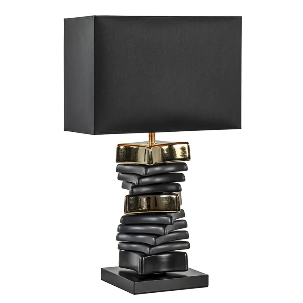 Deze stijlvolle tafellamp is een prachtig exemplaar voor op een dressoir, bijzettafel of zelfs het nachtkastje. Ga voor een chique hotel look in het interieur met deze zwarte tafellamp met goud accenten. De schemerlamp heeft een keramieken voet die is opgebouwd uit losse delen. Doordat deze verspringen ontstaat er een speels design wat, mede door het goud dat erin verwerkt is, een luxe uitstraling heeft. De voet is gecombineerd met een rechthoekige zwarte kap met gouden binnenzijde. De stijlvolle tafellamp heeft een zwart snoer met een lengte van 150 cm en een schakelaar op 30 cm. De lichtbron is exclusief.