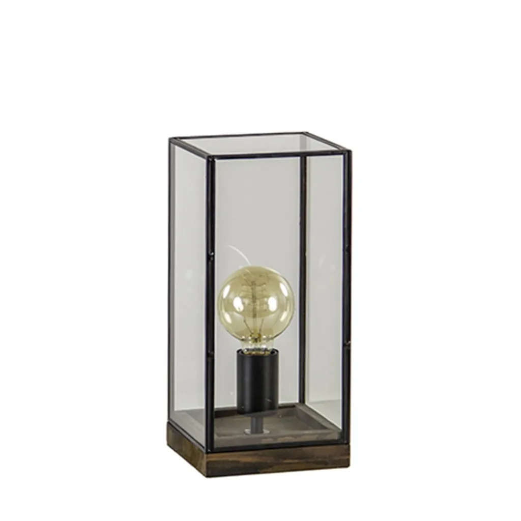 De combinatie van materialen in deze lamp maakt dat deze perfect geschikt is in een landelijke setting. De tafellamp doet denken aan een stolp en werkt ook op dezelfde wijze, de glazen kap is namelijk volledig te verwijderen. De glazen tafellamp heeft een houten voet waar de zwarte fitting in zit verwerkt. De glazen kap is afgewerkt met een zwart metalen frame, dit geeft de tafellamp een wat robuustere look. De lamp staat leuk op een dressoir of kast en wordt geleverd inclusief snoer met schakelaar.