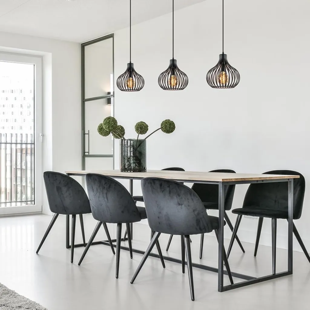 Een sfeervolle 3-lichts hanglamp die prima geschikt is voor boven een lange tafel. De drie kappen zijn gemaakt van een metalen frame die bestaat uit losse speilen en bovenaan de kap samen komen tot één geheel. De kappen zijn van onder open en hangen aan een zwart stofomwonden snoer die in hoogte is te verstellen. De mat zwarte draadlamp wordt aan het plafond opgehangen met een lange balk van 110 cm. Deze zwarte hanglamp brengt met de juiste lichtbron een gezellige sfeer in huis en past mooi in een modern of scandinavisch interieur.