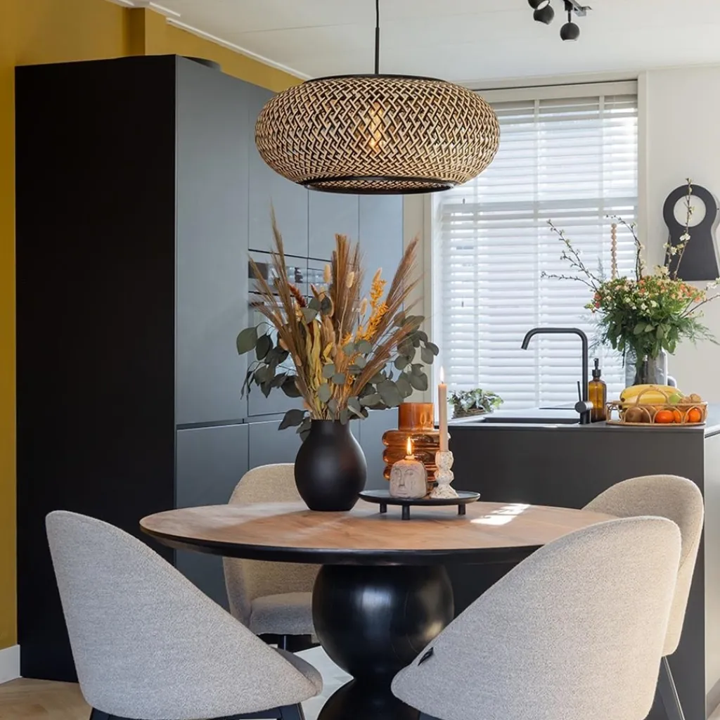 Sfeervol in de woonkamer, eetkamer of slaapkamer. Deze grote hanglamp bamboe kan op meerdere plekken worden toegepast. De kap heeft een doorsnede van 60 cm en is volledig gemaakt van bamboe. Het bamboe is uitgevoerd in het naturel en zwart wat samen een mooi lijnenspel creëert. De grote kap hangt aan een metalen pendel en een zwart stof omwonden snoer die naar wens in hoogte is te verstellen. De maximale hoogte van de lamp is 155 cm. De bamboe hanglamp naturel met zwart wordt bevestigd met een ronde plaat van 11 cm doorsnede en is dimbaar middels een externe dimmer (exclusief).