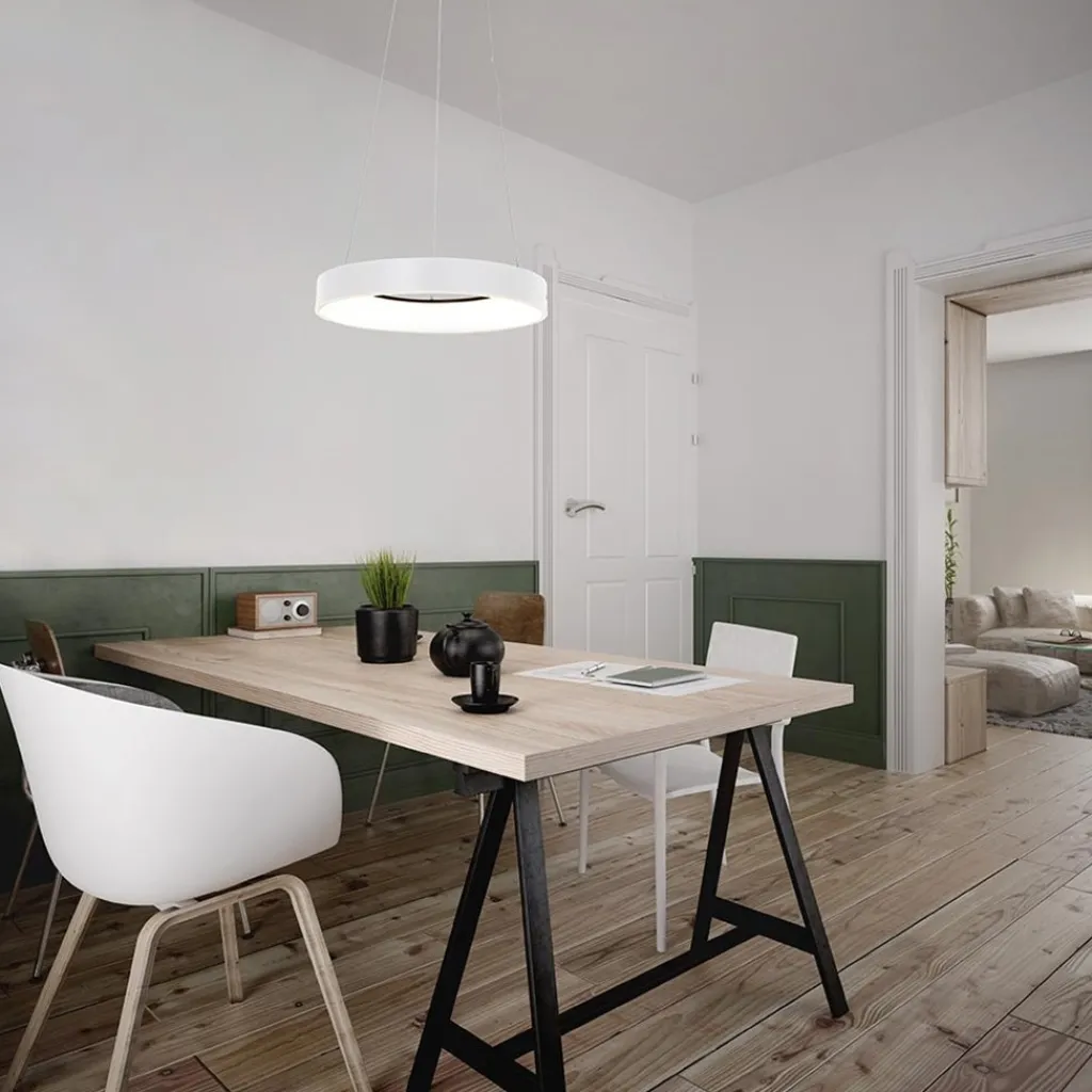 Deze moderne hanglamp is een ideale toevoeging aan het interieur. De witte hanglamp is prima geschikt voor een eetkamer, slaapkamer of kantoor. De ronde hanglamp bestaat uit een metalen ring die is voorzien van een LED strip aan de binnenzijde van de kap. Het LED geeft met 2700 Kelvin een sfeervolle warm witte verlichting en zorgt met 3600 lumen voor genoeg lichtopbrengst. Dit is eventueel te dimmen d.m.v de juiste LED dimmer (exclusief). De LED ring hangt aan 3 smalle staaldraden die naar wens zijn in te korten en de moderne hanglamp wordt aan het plafond bevestigd met een ronde witte bevestiging.
