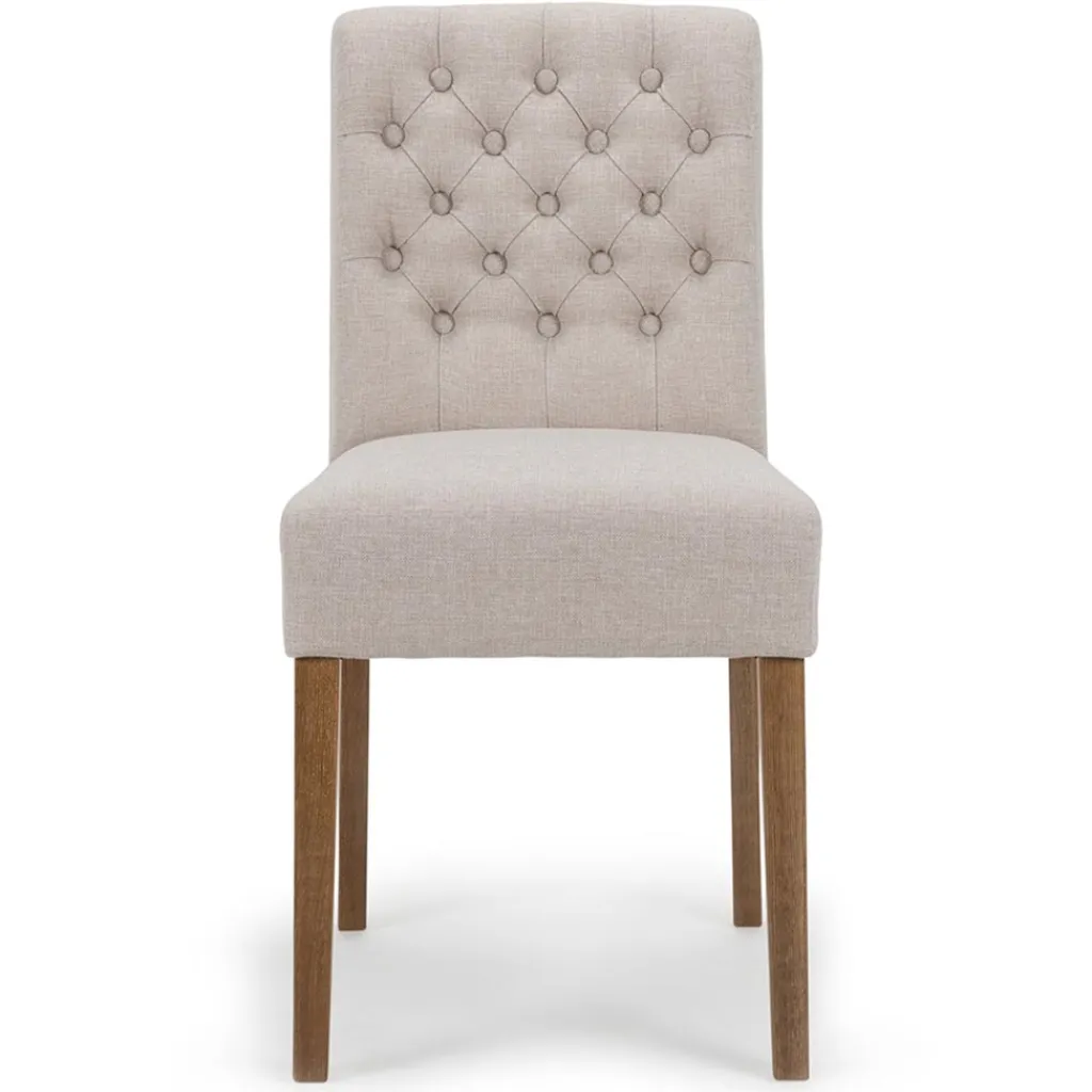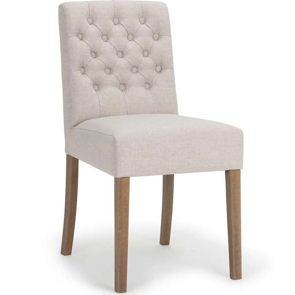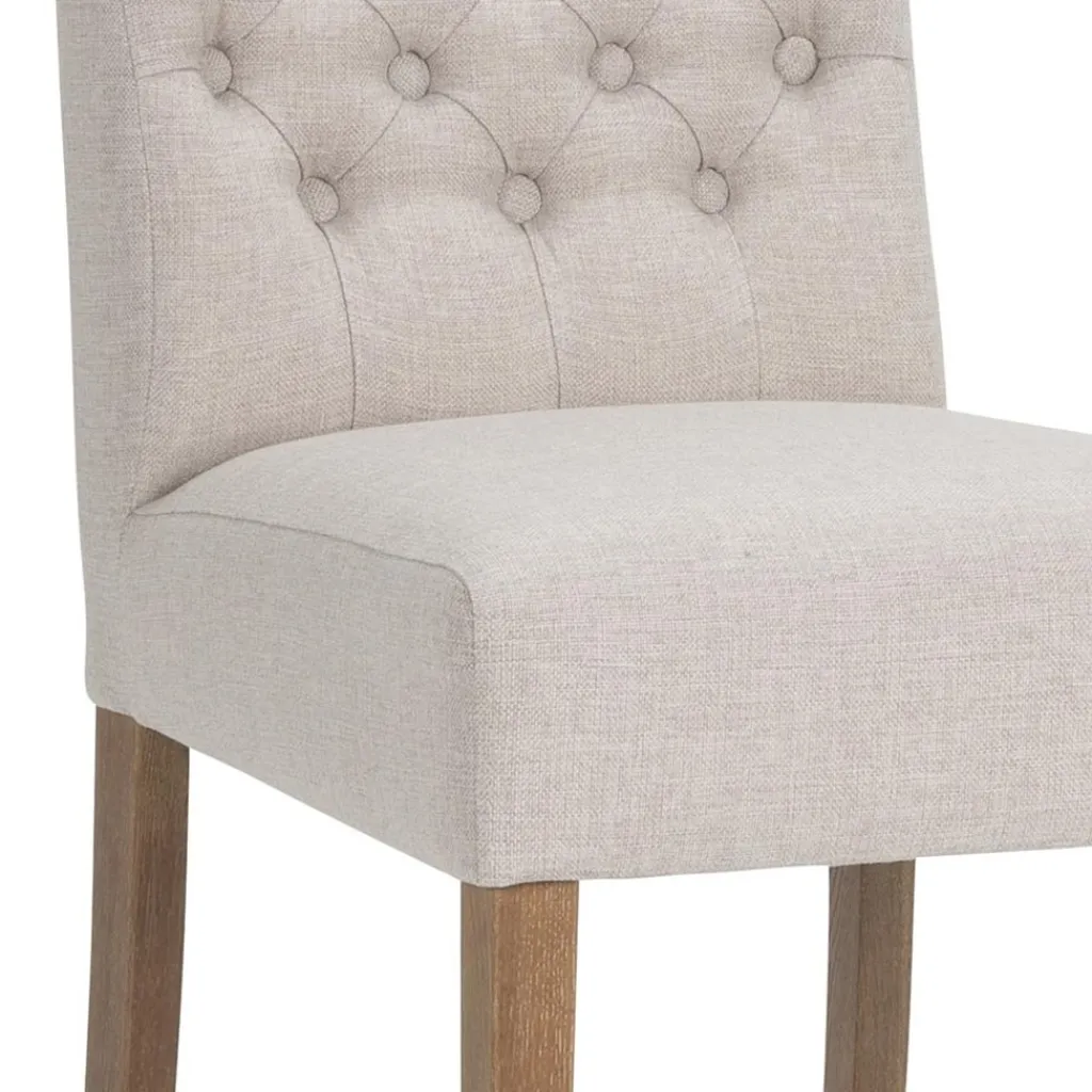 Comfortabel, sfeervol en toepasbaar in diverse woonstijlen als klassiek of landelijk. Deze eetkamerstoel maakt de eetkamer helemaal af en zorgt ervoor dat dineren nog fijner wordt. De stoel heeft een stoffen zitting die is uitgevoerd in het beige. De rugleuning is net als de zitting van stof en voorzien van decoratieve knopen die de stoel een chique uitstraling geeft. De eiken poten geven de stoel een stevig en robuust geheel.