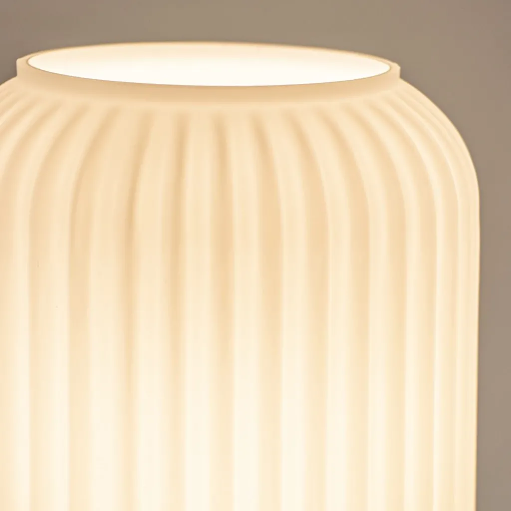 Deze tafellamp is een leuke toevoeging aan het interieur. Door het lage voetje kan de tafellamp op diverse plekken worden toegepast als het dressoir, in een kast of zelfs op het nachtkastje. Het voetje is gemaakt van metaal en uitgevoerd in het mat zwart. Deze ondersteund de mat witte glazen kap met reliëf. Dit geeft de tafellamp een retro look die mooi matcht in diverse stijlen. De tafellamp is voorzien van een zwart snoer met een lengte van 180 cm en wordt geleverd exclusief lichtbron.