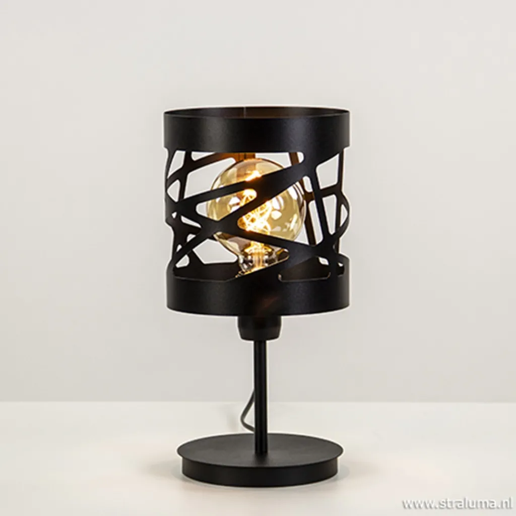 Dit kleine tafellampje is een leuke toevoeging aan het interieur. De metalen lamp past perfect in een modern of Scandinavisch interieur en staat leuk op een dressoir, bureau of bijzettafel. Het sfeerlampje heeft een opengewerkte metalen kap wat een speels lijnenspel geeft en de lamp een moderne en strakke look geeft. De metalen kap zit bevestigd op een zwarte voet en de lamp heeft een zwart snoer met schakelaar.