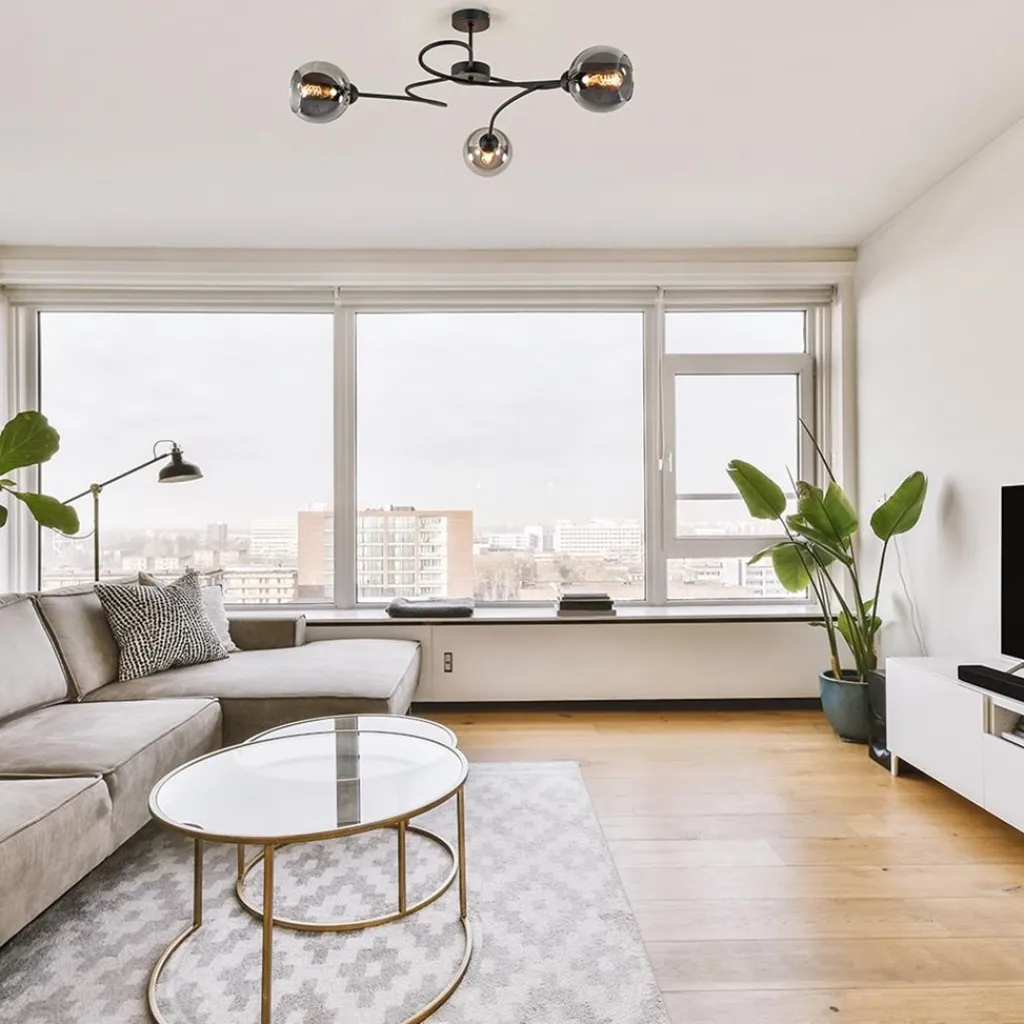 Deze grote plafondlamp heeft een sierlijk elegant deisgn. Het armatuur heeft gekrulde armen die aan het einde zijn voorzien van smoke glazen bollen. Het donkere glas geeft de plafondlamp een chique uitstraling wat mooi matcht in diverse woonstijlen. Het armatuur is gemaakt van metaal en uitgevoerd in het mat zwart. De lamp wordt exclusief lichtbronnen geleverd en is dimbaar middels een externe dimmer (exclusief).
