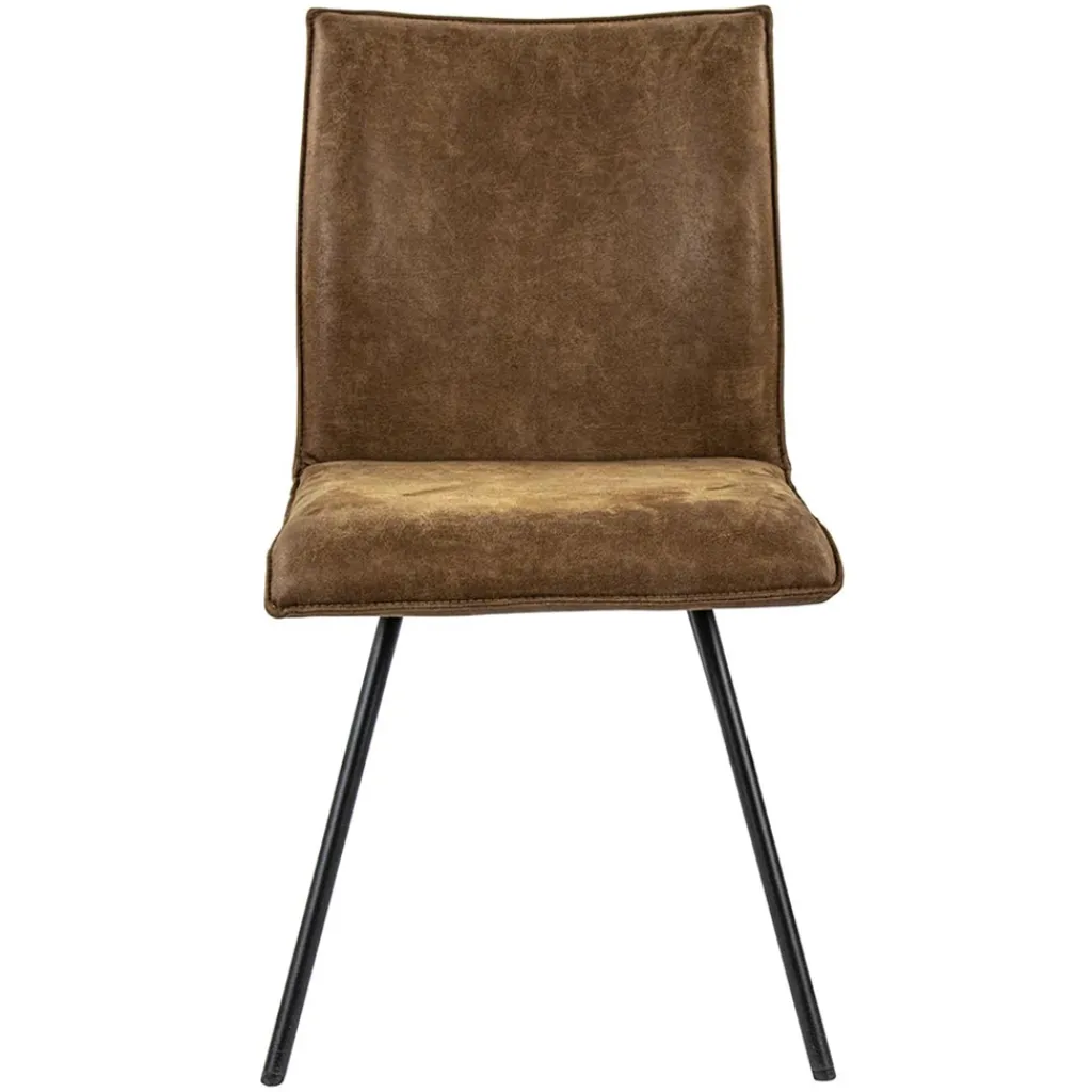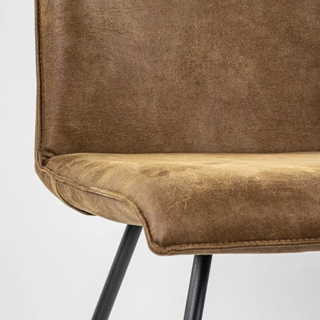 Een landelijke eetkamerstoel met een modern trendy afwerking. De eettafelstoel heeft een dikke zitting die zorgt voor een fijn zitcomfort. Ideaal tijdens het lange tafelen en natafelen. De zitting loopt mooi door in de rugleuning en is volledig gemaakt van PU leder in een mooie camel kleur. De zitting is afgewerkt met opstaand randje. De stoel wordt ondersteund door vier smalle gepoedercoate metalen pootjes in het mat zwart die de landelijke stoel een wat moderne touch geven.