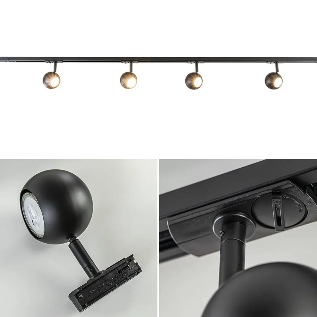 Ideaal om een ruimte extra uit te lichten of meer sfeer aan te brengen. Dit 1-fase railsysteem wordt geleverd inclusief 4 spots, beide uitgevoerd in het zwart. De rail heeft een lengte van 150 cm waar de spots gemakkelijk op kunnen worden verdeeld. Druk de spot in de rail en zet hem vast door de knop om te zetten. De spots kunnen verder nog draaien en kantelen. Bepaal dus zelf hoe u het licht wilt verspreiden. Het railsysteem heeft 1-fase, dit houdt in dat alle lampen tegelijk zullen worden in- en uitgeschakeld. Handig voor in een lange hal of slaapkamer, maar ook in de keuken of woonkamer past dit systeem perfect. De smalle rail en de ronde spots geven een strak en modern geheel aan de ruimte. Het zwarte railsysteem is dimbaar met een externe dimmer.