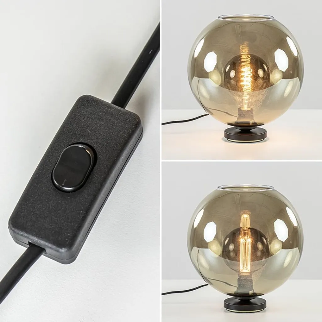 Een sfeervolle tafellamp met een luxe uitstraling. De tafellamp bestaat uit een metalen voet die is uitgevoerd in het mat zwart en een smoke glazen bol met een doorsnede van 30 cm. Het donkere glas geeft een chique luxe uitstraling die mooi is toe te passen in diverse woonstijlen. De tafellamp past perfect op een dressoir, kast of zelfs het nachtkastje. De ronde voet is voorzien van een zwart snoer met een lengte van 180 cm, de knipschakelaar zit op 65 cm in het snoer. De tafellamp smoke glazen bol 30 cm wordt geleverd zonder lichtbron (E27).