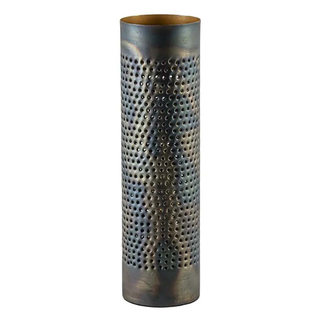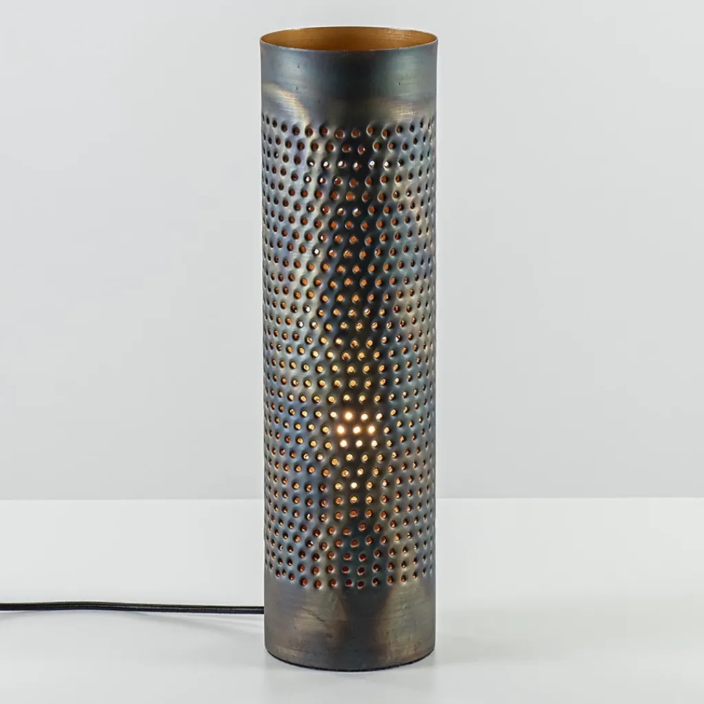 Een originele tafellamp vinden, het klinkt als een lastige opgave, maar dat is het zeker niet! Deze tafellamp gevlamd is namelijk precies wat u zoekt. Deze tafellamp heeft een hele eigen look. Waarom vraagt u zich af? De cilinder kap van deze tafellamp is gevlamd en geperforeerd, waardoor deze lamp een echt authentiek uiterlijk heeft. De binnenkant van de kap is goud gekleurd, wat de tafellamp een hele warme en sfeervolle uitstraling geeft. De metalen tafellamp is voorzien van een zwart snoer met een lengte van 190 cm en een knipschakelaar op 40 cm van de lamp. Deze gevlamde tafellamp wordt geleverd exclusief lichtbron (E27).