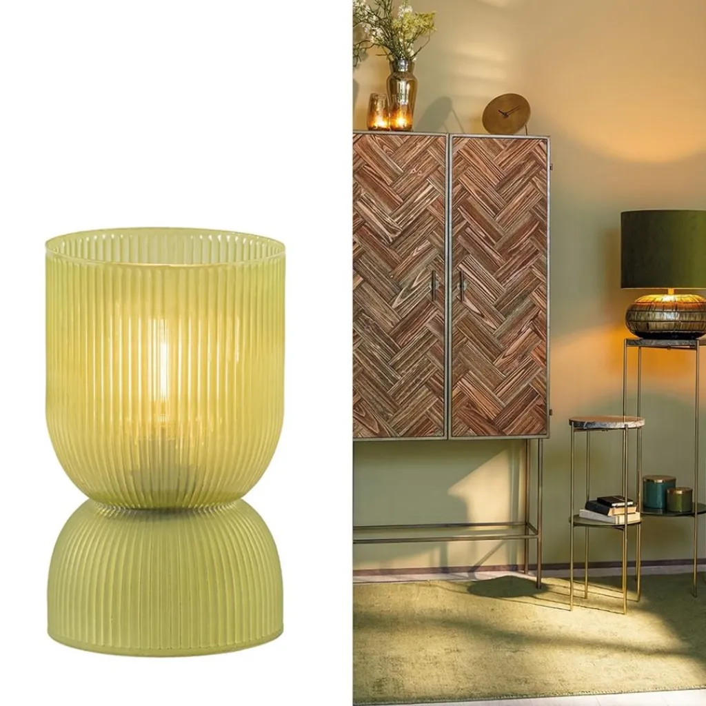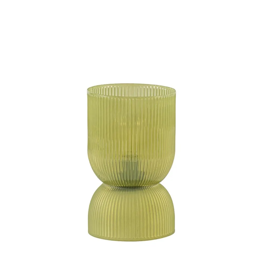 Tafellamp gemaakt van licht olijf groen ribbelglas. Het tafellampje heeft de vorm van een diabolo. Bij de voet is het ribbelglas mat, het bovenste deel van het glas heeft een subtiele glans. Prachtig op een slaapkamer, op de salontafel of een tiener of studentenkamer. Dit lampje werkt op 2x AAA batterijen, dus het is overal te gebruiken. Mooi in een landelijk, romantisch of botanisch interieur.