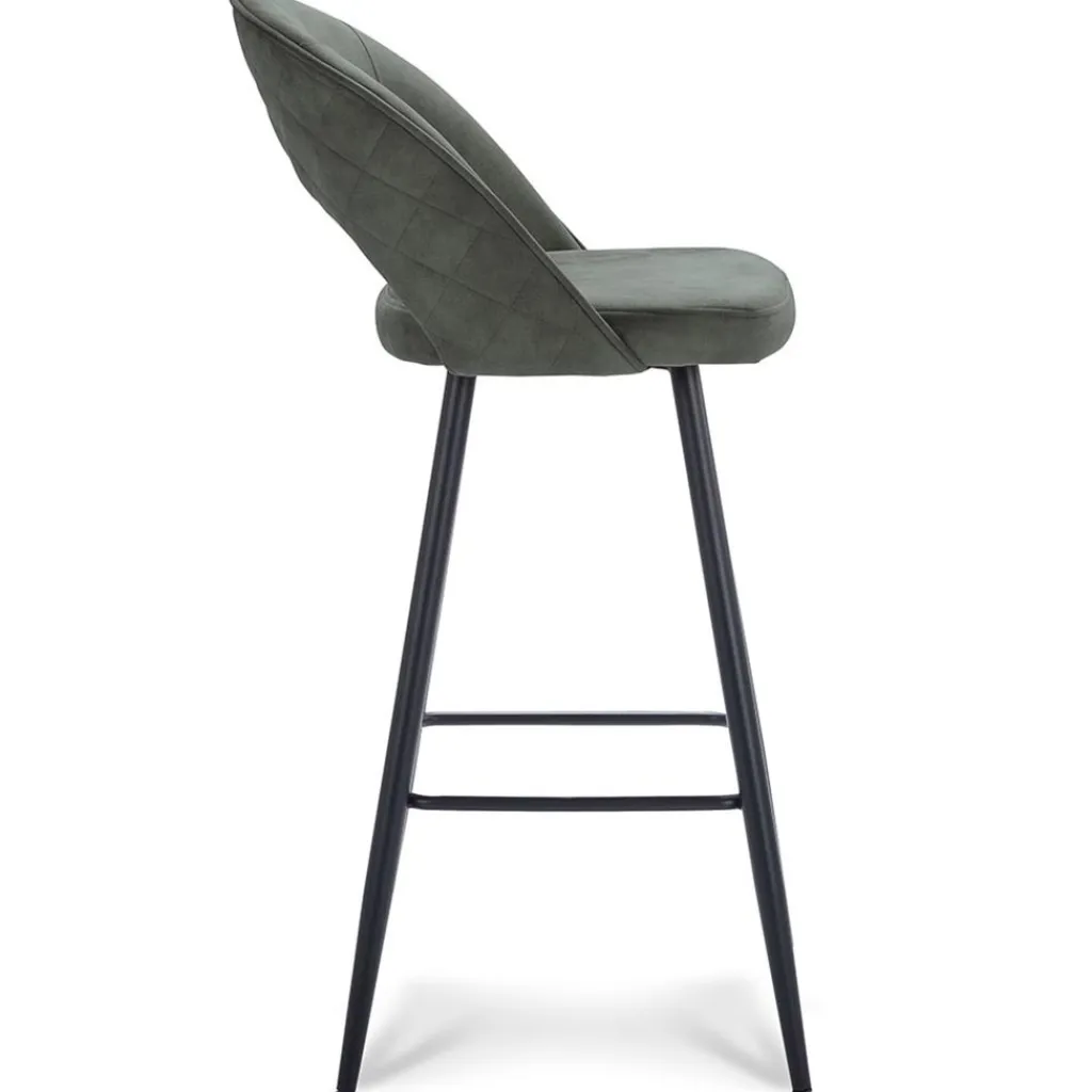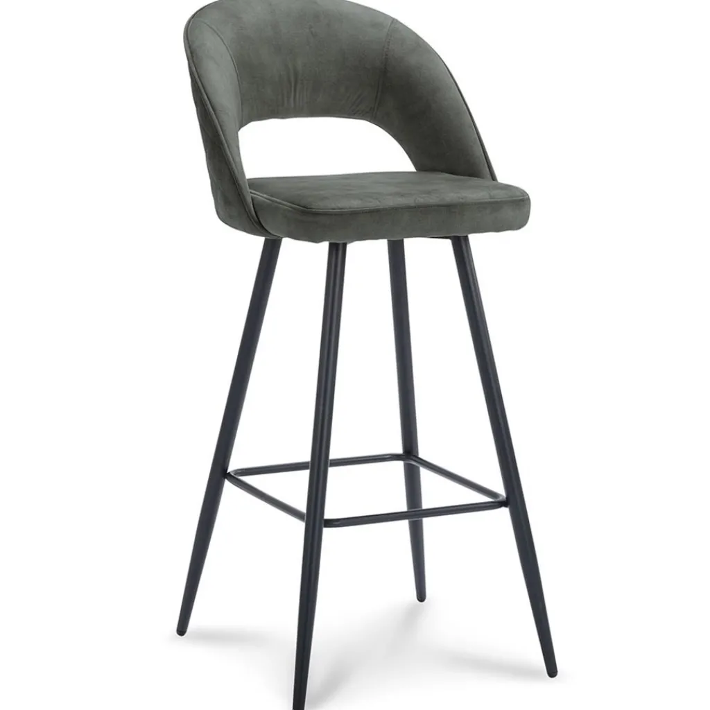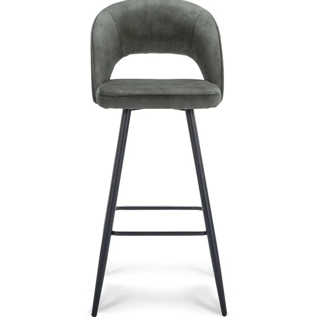 Chique, trendy en comfortabel. Deze fijne barkruk zorgt met een zacht zitkussen voor een fijne zit die wordt versterkt door de rugleuning. Deze is van onder open voor een mooi open effect. De zitting en de rugleuning zijn volledig van een velourse stof wat een chique luxe uitstraling geeft. Het stiksel op de rug geeft hier nog extra allure aan. De barstoel is verder afgewerkt met zwarte pootjes met een extra voetensteun.