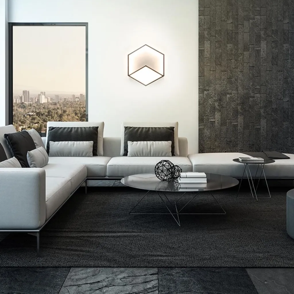Een strak design met een optisch effect. Deze hexagon wand/plafondlamp heeft een minimaal armatuur dat met de juiste hoek lijkt op een driedimensionale kubus. Het armatuur is gemaakt van aluminium en uitgevoerd in het zwart. De lamp is voorzien van LED dat op twee plekken is verwerkt, in de ruit aan de voorzijde en achter het smalle armatuur. Dit laatste geeft een sfeervol effect op de ondergrond en zorgt zo voor mooi indirect licht. De LED lamp kan dienen als plafondlamp en wandlamp en is dimbaar middels een extene dimmer (exclusief).