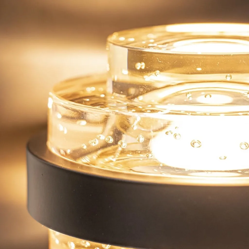 Een prachtige wandlamp voor naast de bank, in de hal of bij het bed. Deze kleine wandlamp bestaat uit een mat zwart metalen armatuur dat is gecombineerd met champagne kleurig glas. In het glas zitten ook belletjes verwerkt wat het effect nog extra benadrukt, vooral wanneer de lamp is ingeschakeld. De wandlamp is voorzien van LED en geeft met 450 lumen een fijne lichtopbrengst. De glazen wandlamp wordt geleverd inclusief zwart met een lengte van 165 cm, de schakelaar bevindt zich op 40 cm in het snoer.